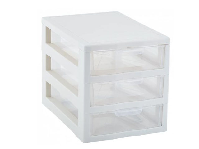 Универсален, лек правоъгълен органайзер с три чекмеджета, с размер 27х19х20 см., произведен от висококачествена прозрачна пластмаса и в цвят бяла роза.