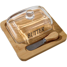 Съд за масло със стъклен капак | Комплект с бамбукова подложка и прибори